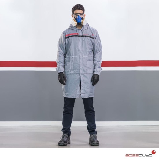 Hingavast nailonmaterjalist kittel. Pestav. See on antistaatiline, tõrjub tolmu ja sellel on reguleeritav kapuuts.